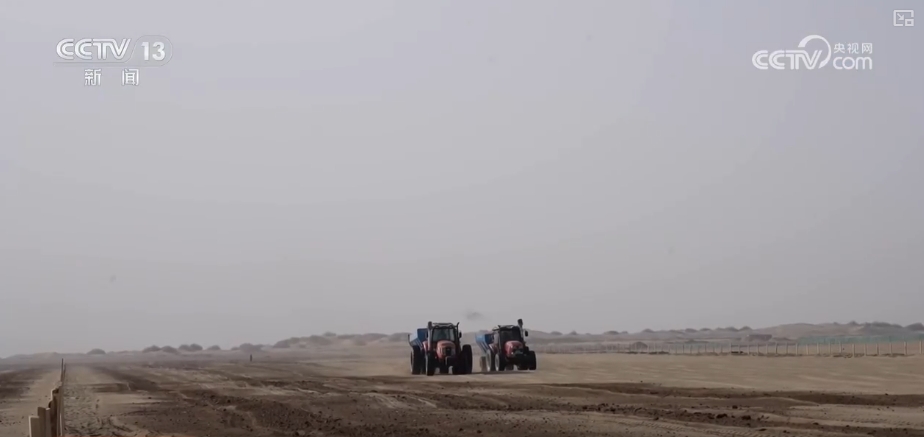 取平沙现场一样忙碌的,一辆辆满载发酵羊粪、秸秆腐熟料的卡车将1万多吨无机肥有序倾泻正在田间,旋耕机随即将其深翻入土,提高沙土无机质和养分含量,确保种植的农做物一般发展。